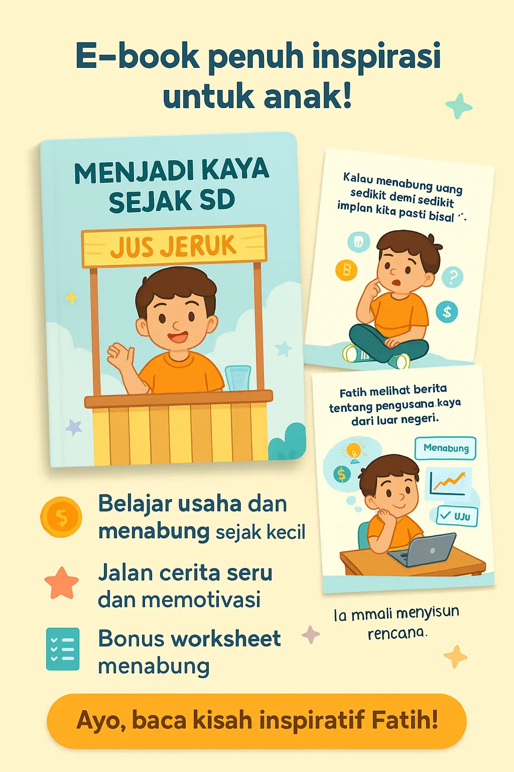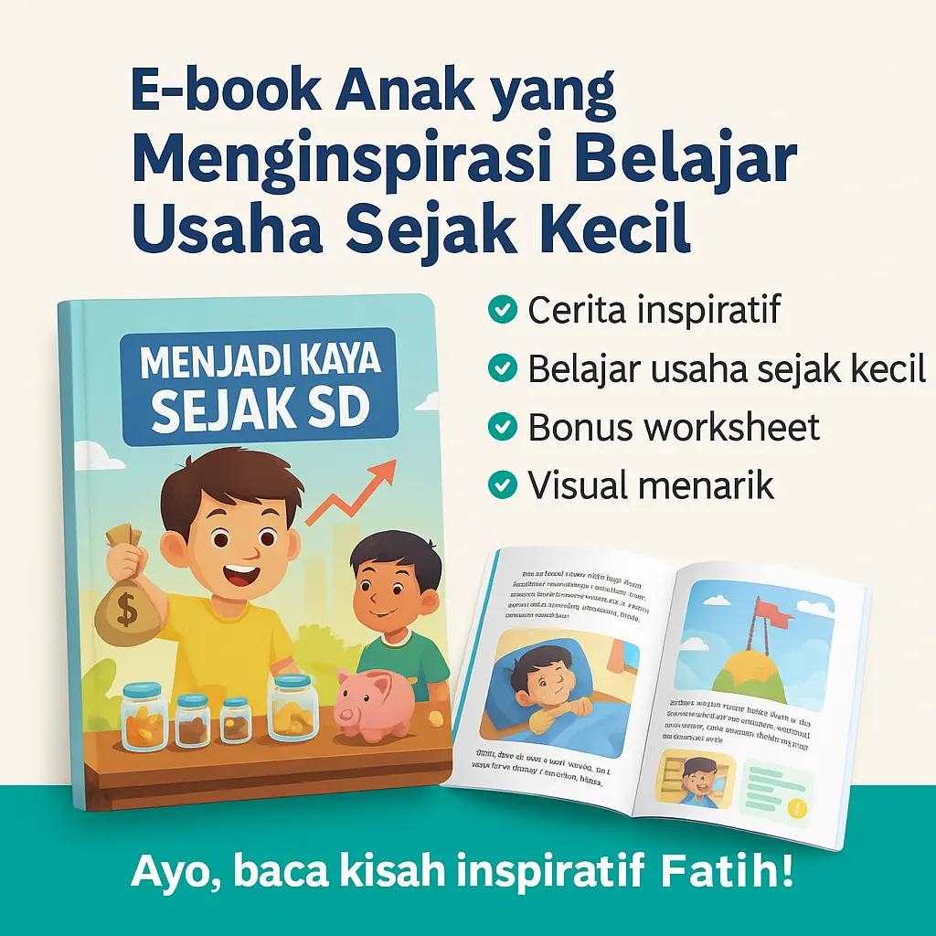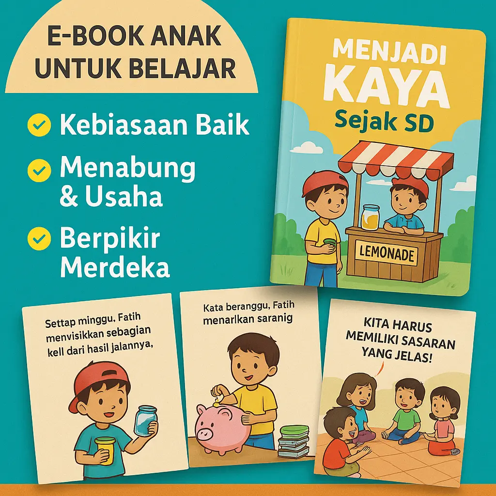Menjadi Kaya Sejak SD adalah e-book edukasi anak full color yang mengajarkan nilai usaha, menabung, disiplin, dan perencanaan masa depan melalui kisah inspiratif seorang anak bernama Fatih.